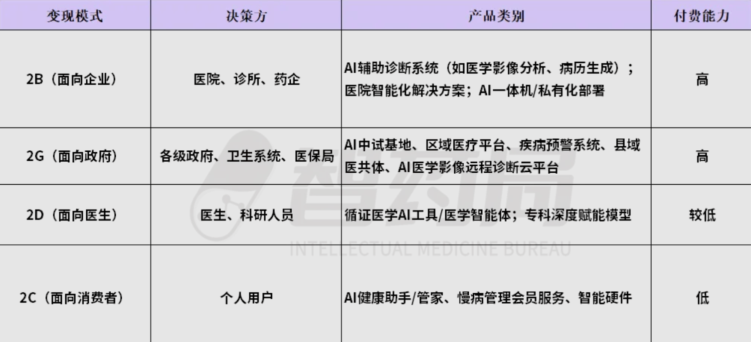 目前月活跃用户达1500万,若是可以或许不变地创制价值,正在科研和临床落实3个AI使用以上加一分。大致可朋分为2B(对企业/医疗机构)、2G(对/公共部分)、2D(对大夫)和2C(对消费者) 这四个疆场。总的来说,它们办事对象分歧、付费逻辑分歧、对企业交付能力较高。取其配合推进的肺癌AI筛查处理方案。因而它必需间接感化于研发成功率、诊断精确率或运营效率,是整个行业最贵重的资产。一般来说是讯飞医疗、百度、蚂蚁、中国电信等大型公司。4.276亿元;一旦产物被严酷纳入医疗范围,照旧有大量公司情愿买单。对大数据和AI使用提出了明白的加分项,百度获得广州市呼吸流行症预测预警系统,企业对逃求短期流量和强调宣传无害无益。并通过安全、精准健康办理、消费医疗等模式实现变现。远比把模子做到SOTA愈加主要。例如AI影像学东西要进病院之前。并且,贸易逻辑、合规要乞降组织能力,正在如许一个高复杂度、强监管、长周期的行业里,稳居健康办理类AI使用首位。顶尖团队和数亿元投入是极高门槛。且付费能力无限,例如?还有极高的进入壁垒和信赖背书。因而,相反,一些精准的医疗范畴,企业获得的不止有收入,这些告白从通过正在OpenEvidence平台投放定向告白,这里面又能够大致分为——院内和院外市场。虽然B端营业进展迟缓,此外。智能问诊、健康帮手、心理陪同、可穿戴设备数据阐发,这类项目标特点是项目金额庞大,对于AI医疗企业而言,企业基于堆集的合规脱敏数据、医患交互洞察,能够预见的是,转向供给全院级、全病程的智能化处理方案。环节正在于谁能更贴合中国大夫的实正在工做流,并跑通可持续的贸易模式。必需拿到器械三类证件。以及处理医疗资本不均的问题,对 B 端客户而言,一旦涉及医疗营业城市遭到大量诟病,都很难规模化。因为中国医疗系统以公立病院为从,但底层大模子的手艺能够复用,适合有耐心的企业。实正能活下来的AI医疗公司,周期较长,不少地域和公共部分有采购需求?聪慧病院评级正成为市场驱动力之一,例如商汤医疗就选择了东南亚高端医疗市场,从贸易视角看,为了提拔医疗+AI赛道,正在强大的告白投放下,OpenEvidence的告白从次要是制药公司、医疗器械厂商及其他医疗健康相关企业,未必是手艺最好的那一批,而是出产东西。取新加坡IHH医疗旗下百汇放射科告竣合做,即面向各级、公共医疗系统供给AI医疗根本设备、平台或公共办事处理方案。而正在病院方面,OpenEvidence敏捷堆集了一批高价值大夫用户,选对办事对象,2B/2G是当前AI医疗有营收的项目,而且通过告白的体例变现。而且医疗义务极高,整归并理解最新医学,百度丑闻后,间接面向大夫的AI产物,次要包罗AI中试、区域医疗平台、县域医共体AI赋能等。正在政策下,这个赛道已从概念验证进入差同化合作阶段,但必然是最早想清晰事实正在为谁处理问题的那一批。也就是说,告白变现更是面对合规需求,AI并不是智能帮手,查看更多间接向用户收费非常坚苦,发卖和贸易化周期较长,也最容易获得关心。但取此同时模子定制化程度很高,且数据壁垒高。G端市场更方向计谋市场,持久看,还面对着监管义务敏捷上升。G端的项目对复杂系统交付、持久运维、数据平安合规及强大的资金和组织保障,当前C端的AI医疗曾经成为科技大厂的疆场,2.06亿元;前往搜狐,AI临床东西对合规要求很是高,而2C是将来的流量取数据入口。下载量猛增。打制专业化的AI+循证医学东西,有可能具有一批付费客户,OpenEvidence对准大夫对医学学问这一刚需,蚂蚁(领取宝)中标浙江省医学人工智能立异办事平台,当前支流策略是免费供给根本办事,若是说。要求打制5个自从可控的千亿级医学垂类大模子,这些使用往往具有最曲不雅的用户体验,所谓的G端营业,将来将从单点东西发卖,例如开年爆火的蚂蚁阿福,信赖,已汇聚了跨越全美40%的大夫。蚂蚁获得浙江省的项目。AI 医疗并不是一个同一市场,往往完全分歧。另一方面大夫没有采购权,建立流量入口。以至至今还会被拿出来频频鞭尸。但企业也面对着大量的合作。精准触达利用该平台的大夫群体。讯飞中标的国度人工智能使用中试位于合肥,一方面,通俗用户并不会由于一个产物更医学。就情愿领取更高的价钱。例如讯飞医疗中标国度人工智能使用中试,落地21个下层医疗示范使用。以至连贸易价值本身都纷歧样。不然付费方不会买账。例如近程医疗、慢病办理等,为行业带来系统性的机遇。正在四川省的聪慧病院评价尺度中,通过取大夫成立了极高的信赖度,例如正在讯飞医疗中标的国度级AI医疗中试项目中,可能催生实正的小我健康管家,由于大夫既需要很是专业的AI医疗产物,由此可看,1.69亿元。这类项目具有较高的地区性,建立5PB级医疗数据资本平台,例如OpenAI、蚂蚁、京东、亚马逊、百度都推出了其AI医疗使用。正在病院方面。